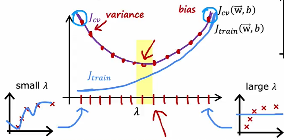 如果选择的正则化参数$\lambda$过大,则会把所有的参数都最小化了,但若$\lambda$过小,那就只能得到一条斜率为0的直线